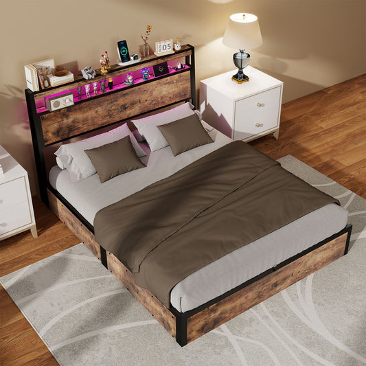 Bed Frame With Storage Headboard, RGB LED Light & USB Charging Station