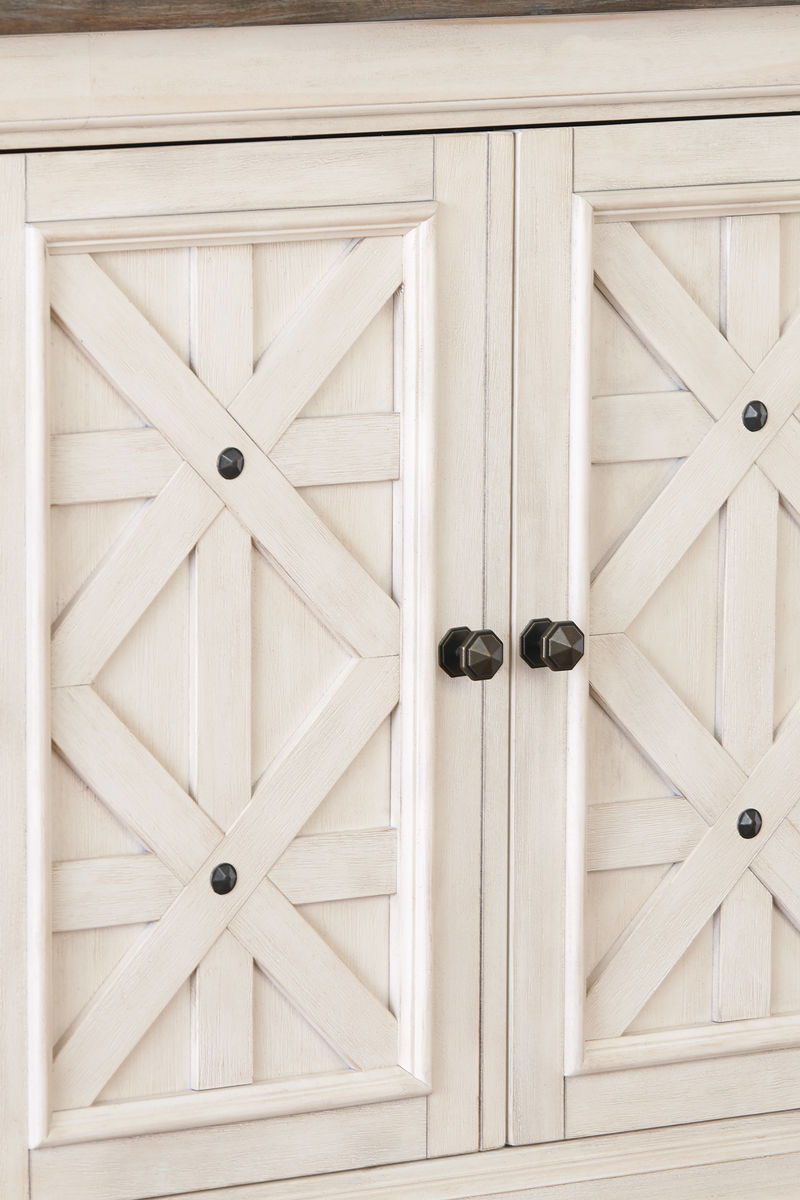 Unique two-tone finish with a combination of Oak and Acacia substrates combining a trendy textured antique white color with table and server tops finished in a textural weathered oak finish. Rectangular dining table features six convenient drawers for storing smaller items. The -02 upholstered host chair inspired by the trendy deconstructed styles for casual living. The -01 side chairs feature a boxed cushion seat. All chairs feature a heavy woven fabric for added textural qualities. The large capacity server has three doors with lattice design. The tall bunching unit has two drawers, three shelves and open lattice sides. D647-32 rectangular counter table features four convenient drawers for storing smaller items. All chairs feature a heavy woven fabric for added textural qualities. D647-13 round drop leaf counter table converts to smaller square version and has a shelf for storage. The D647-42 table will seat four guests with storage cabinet on one end. Storage cabinet has a drawer located at the bottom with a single adjustable shelf located behind two doors above. D647-09 is made with solid wood, veneer and engineered wood substrate in antique white. Heavy woven polyester fabric with nail head trim. D647-55T/B table sets on a stylish double pedestal base and extends to 103" long. The D647-08 extra large bench with thick upholstered seat cushion.