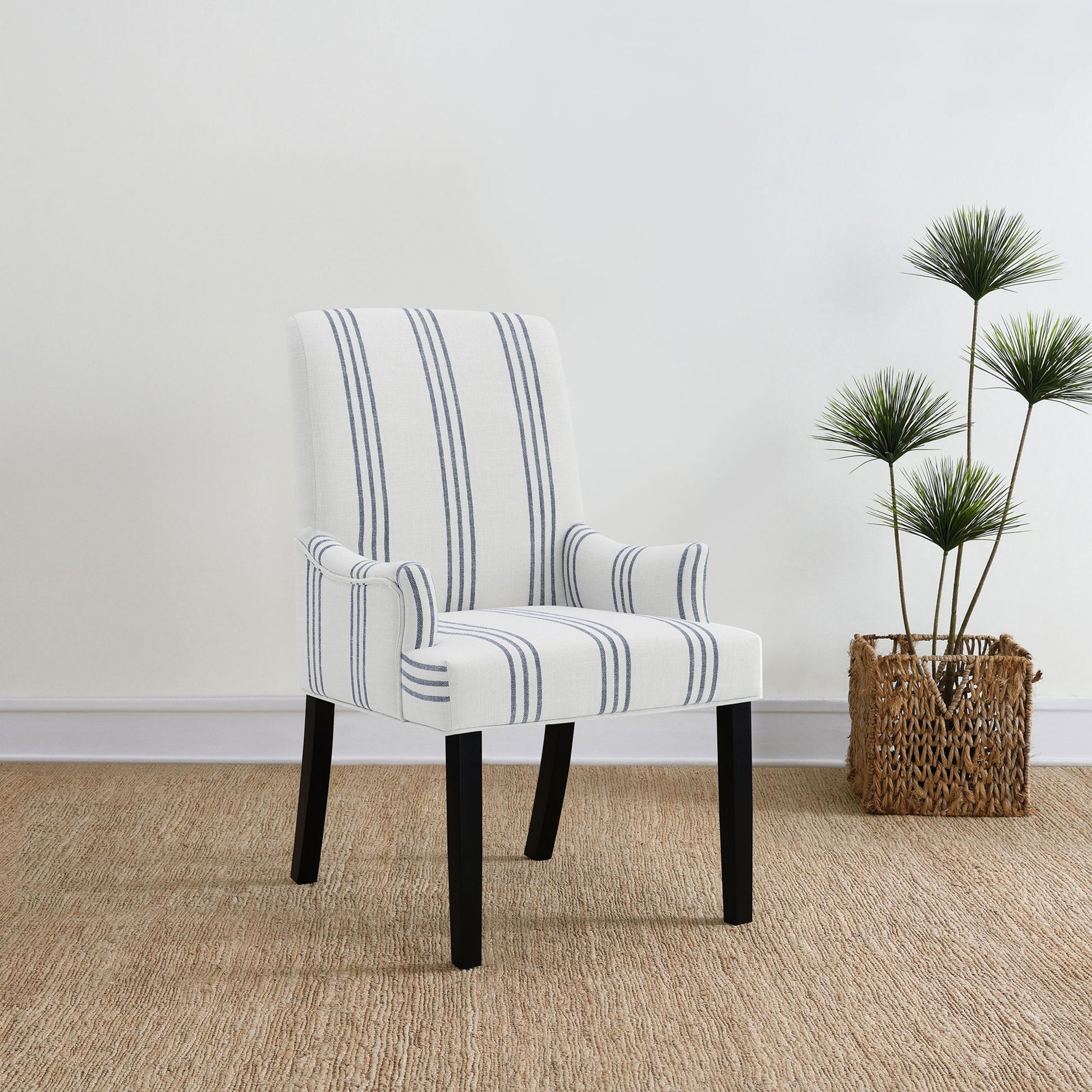 - Upholstered in beige linen-like fabric with subtle blue stripes adds visual interest and timeless elegance