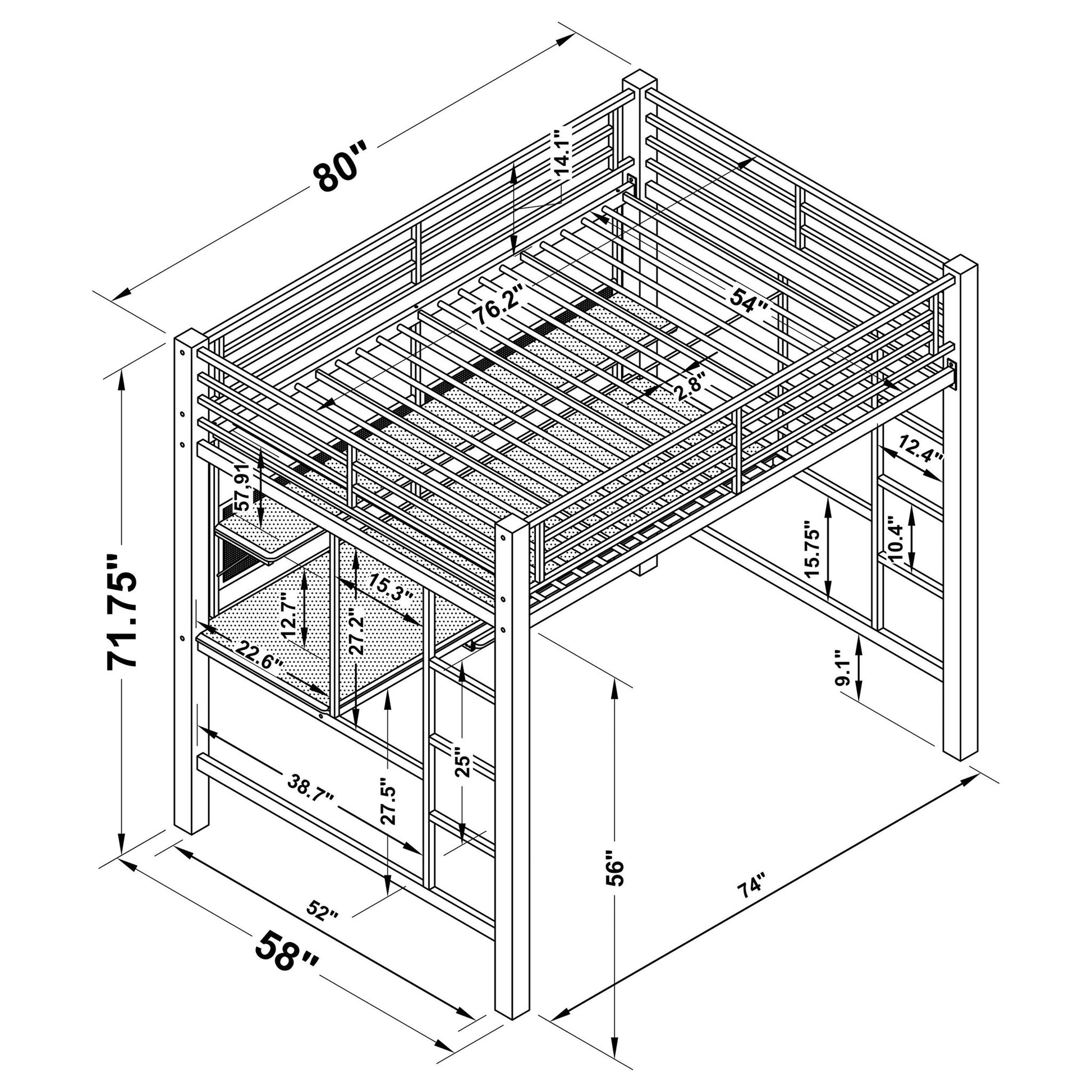 Ranier - Full Workstation Loft Bed, Full Length Desk, Safety Rails And Storage Shelves - Black