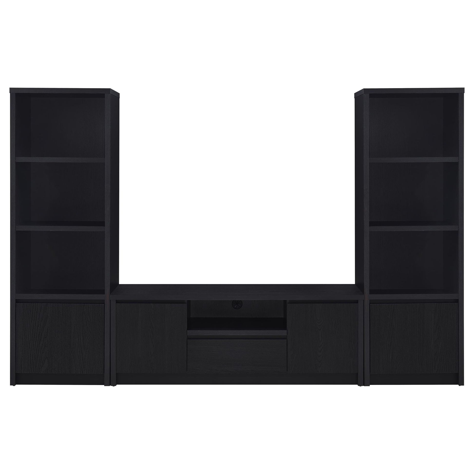 - Three open shelves and bottom cabinet in media towers offer versatile storage for electronics and décor