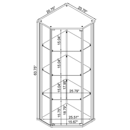 Bring your decor to elegant life with this stunning, modern curio cabinet. A triangular silhouette with cool, clipped corners adds artistic appeal to this glamorous piece. The sleek, metal supports flaunt a gleaming chrome finish. Three tiers of shelving offer elegant display space for photos and decorative keepsakes. Crafted of metal and tempered glass, this beautiful cabinet is built for superior strength and durability.